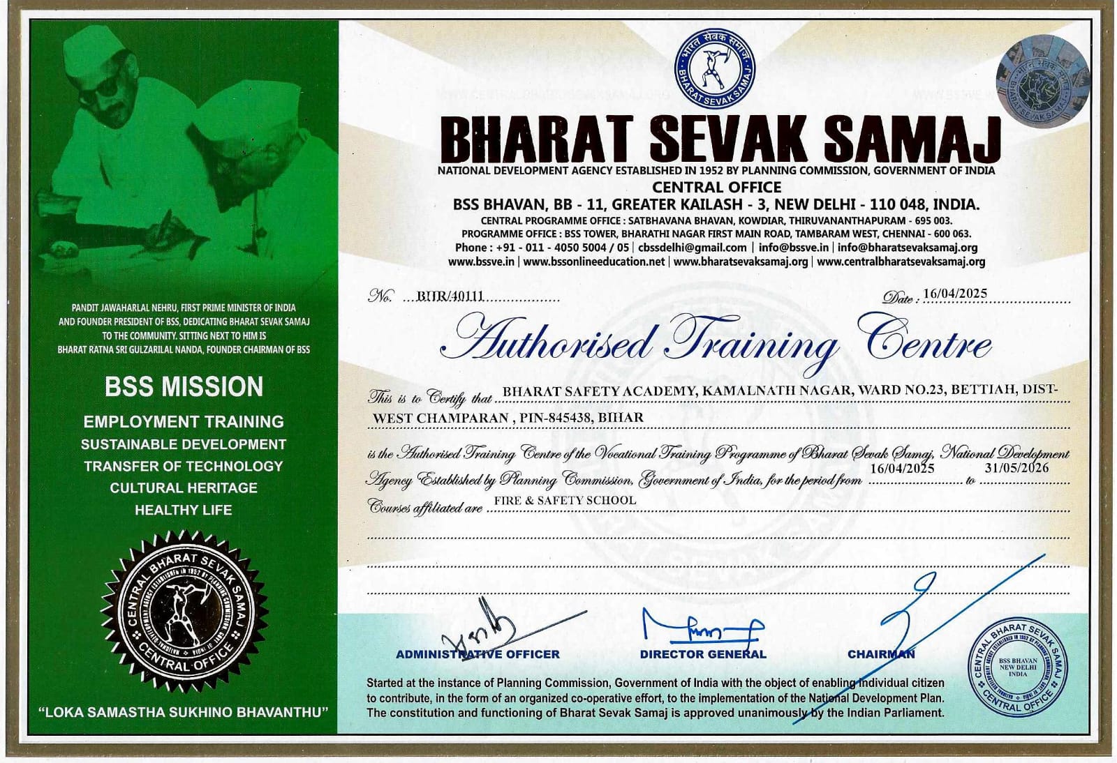 Bharat Safety Academy is committed to provide world-class training in health, safety and environment management. As a leading Safety Training Academy, we offer a wide range of HSE Courses. Bharat Safety Academy is affiliated with Bharat Sewak Samaj (National Development Agency, Established in 1952 by Planning Commission, Government of India, New Delhi and World Skill Council London). We are also working in association with many internationally recognized courses provider and Verifications designed to empower professionals in the safety and management sectors.